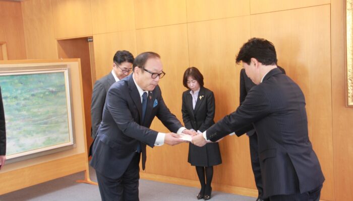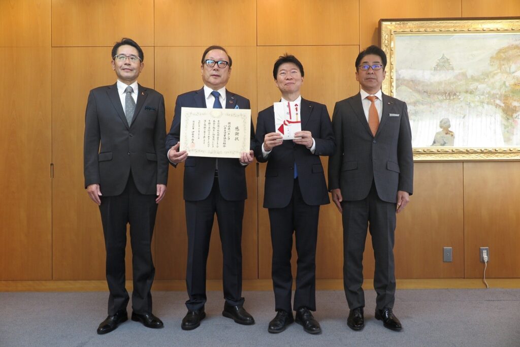 本職及び三井浩一副理事長、三澤幸芳専務理事の3人で岡山県庁を訪問し、伊原木岡山県知事に「将来の宝である子ども達たちが健やかに育つための組合員の思いをお届けに来ました。皆さまのためにお役立てください。」と寄付金を贈呈した。